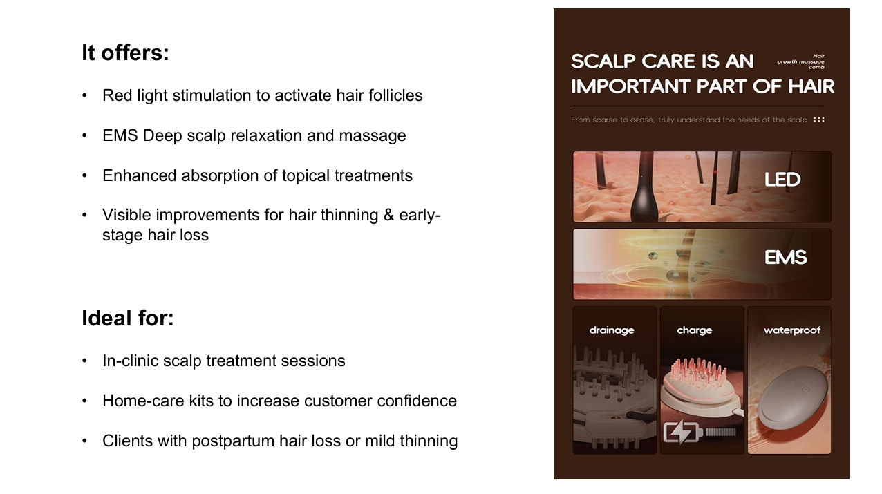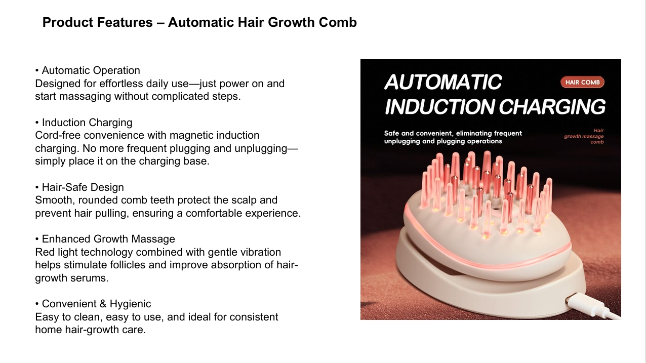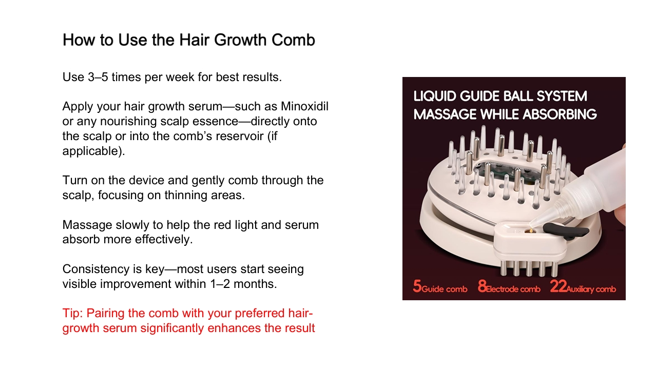 Red Light Hair Growth Comb – Stimulates scalp with 650nm red light to promote hair growth, strengthen follicles, and improve scalp health. Lightweight and easy to use, ideal for daily at-home hair care and thicker, healthier hair.