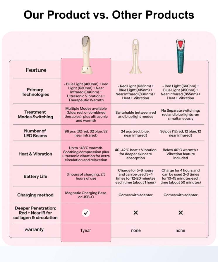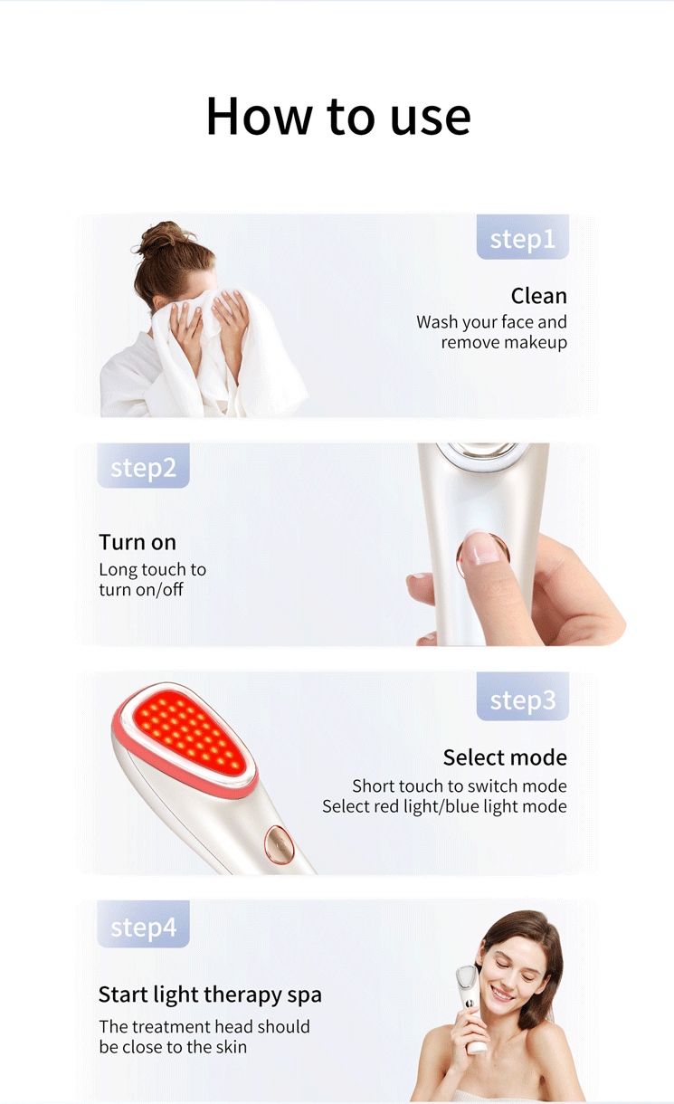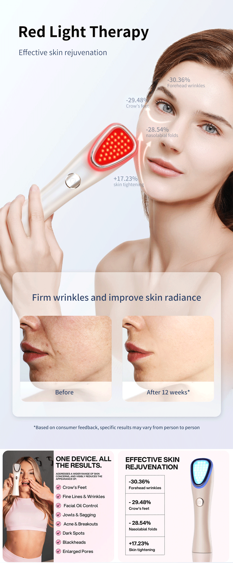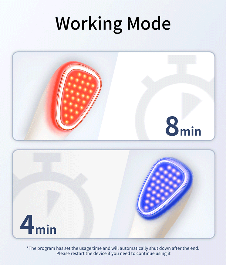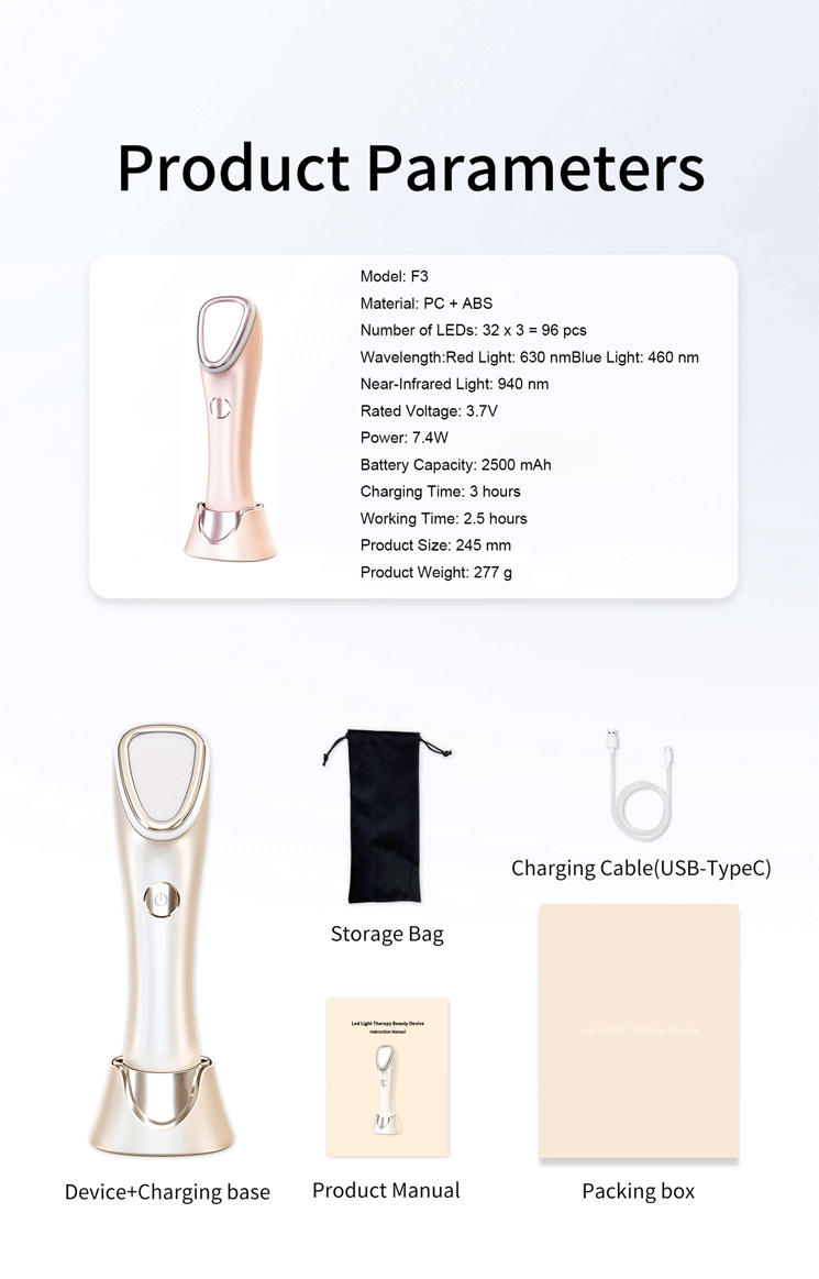 The F3 uses dual red and blue light therapy with heat and massage to reduce fine lines, firm skin, and brighten complexion. Red light boosts collagen to improve sagging and wrinkles, while blue light soothes skin and balances oil. Featuring a smart timer, easy operation, and lightweight, portable design, it’s ideal for daily home skincare and anti-aging.